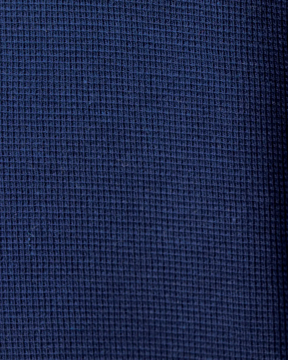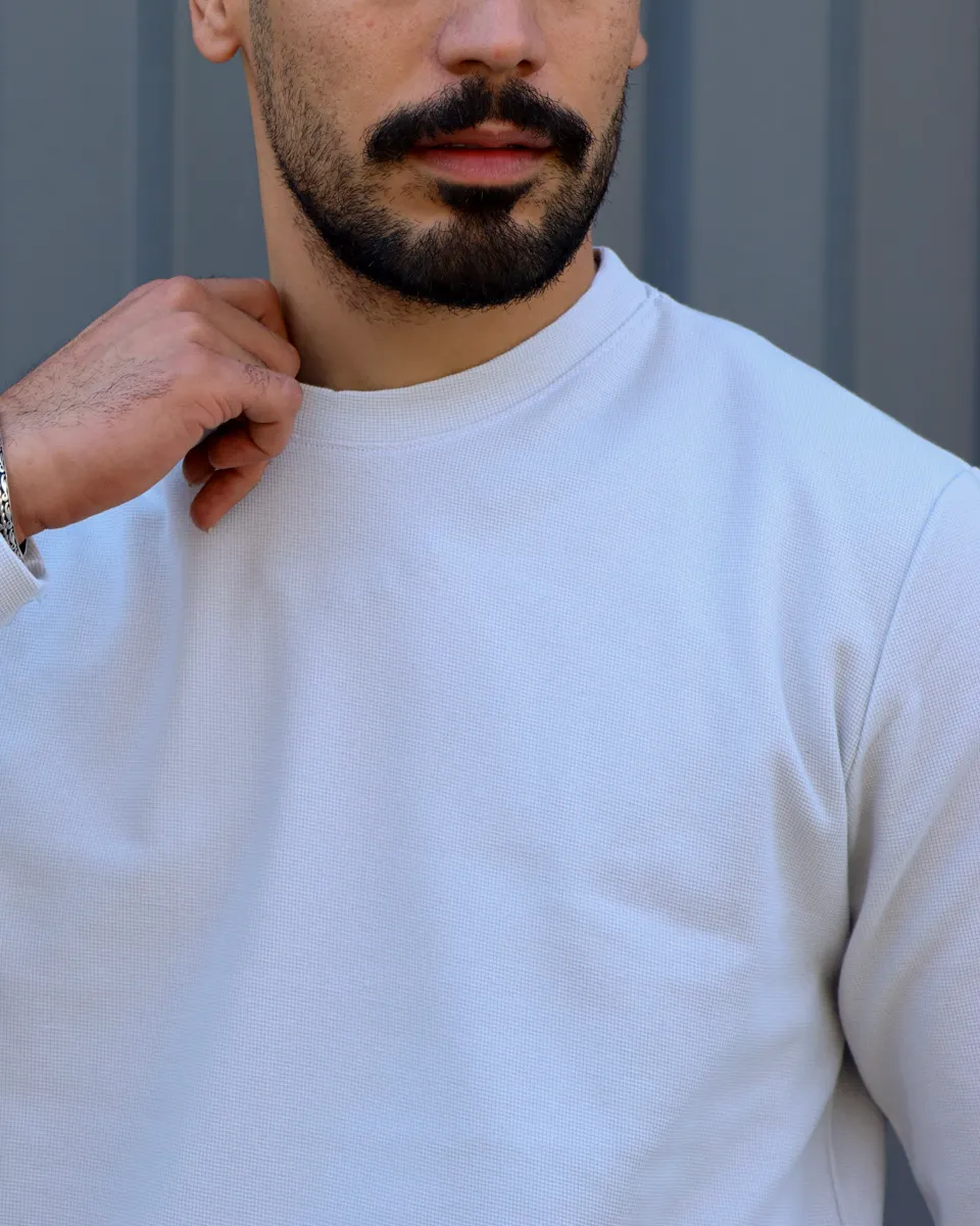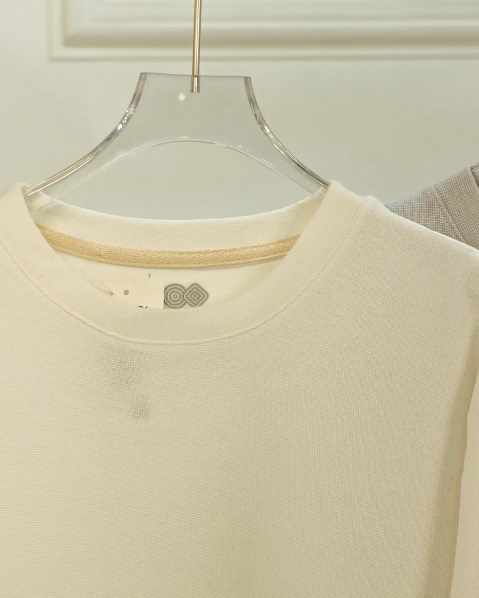 • بافت بیسکویتی (Waffle Knit): این بافت به دلیل ساختار شبکه‌ای و مربعی خود، هوا را بین لایه‌های پارچه حبس کرده و مانند یک عایق طبیعی عمل می‌کند؛ در هوای سرد شما را گرم نگه می‌دارد و در عین حال به دلیل جنس پنبه‌ای، کاملاً تنفس‌پذیر است و از تعریق زیاد جلوگیری می‌کند. این ویژگی آن را برای تمام فصول مناسب می‌سازد.