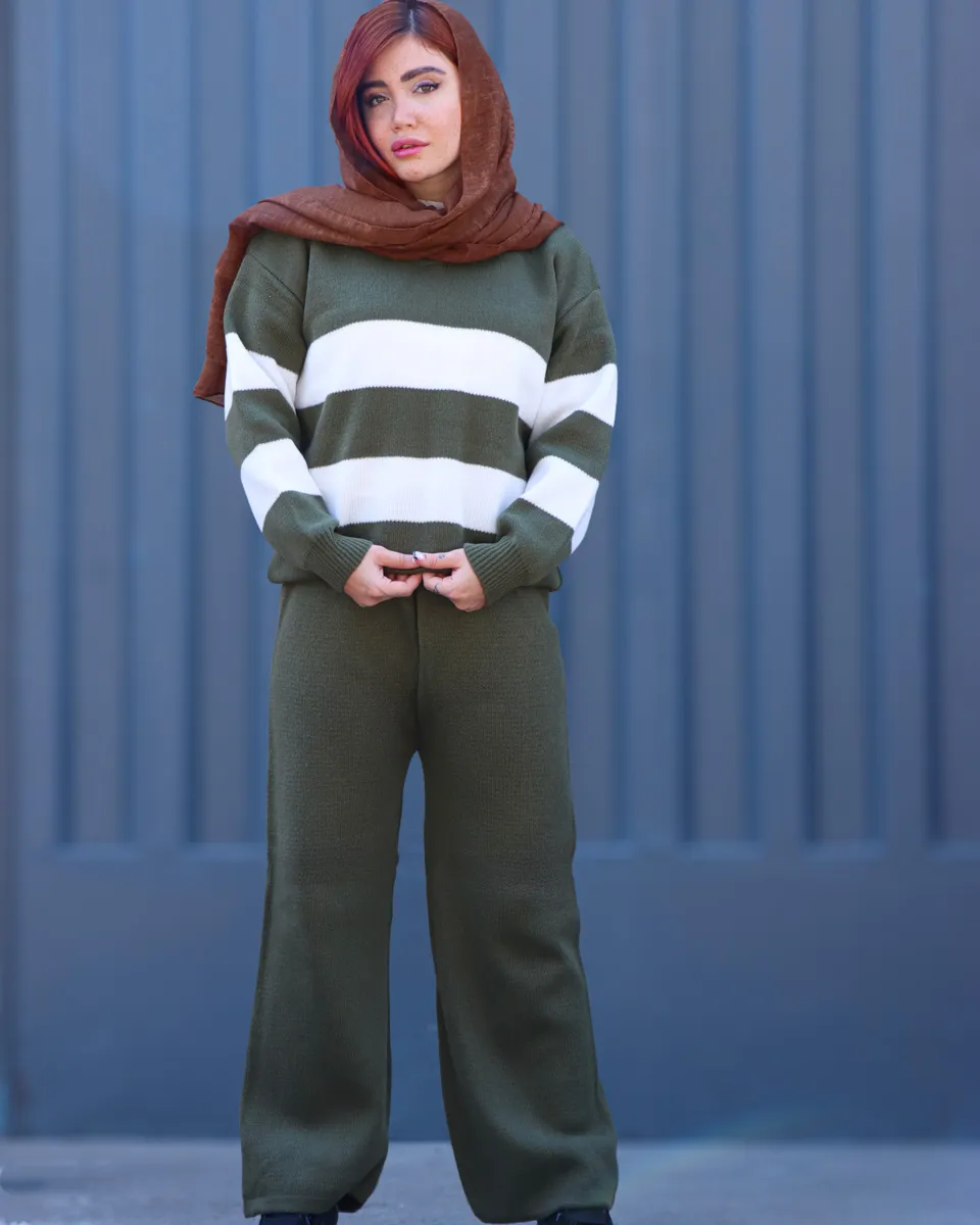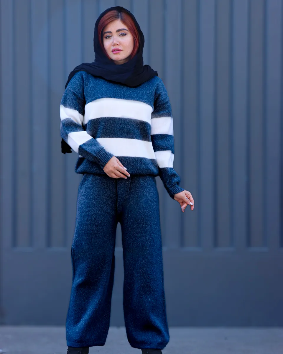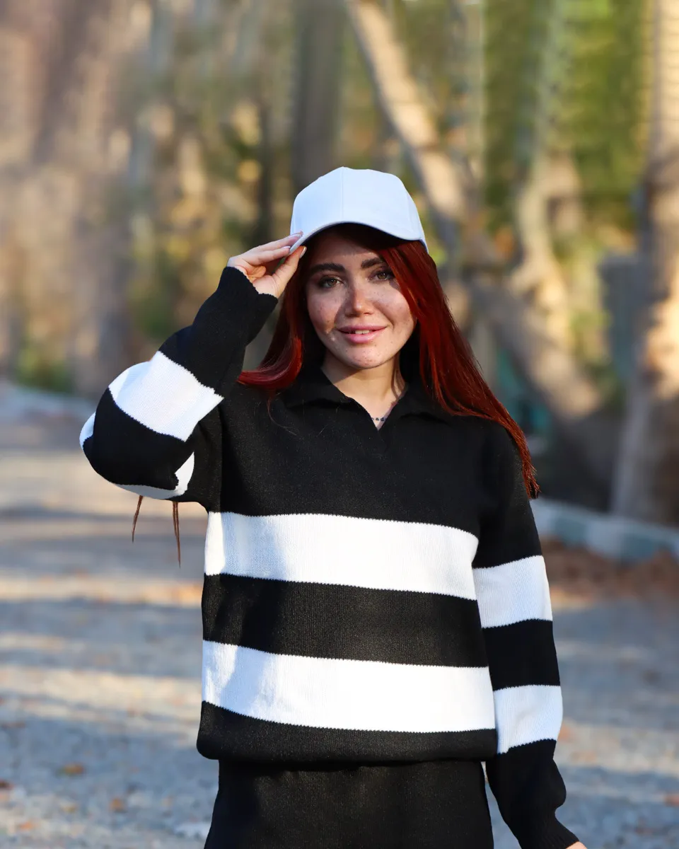 این ست بافت یقه شکاری با طراحی اسپرت و راهراه کلاسیک، به راحتی استایل شما را کامل میکند.