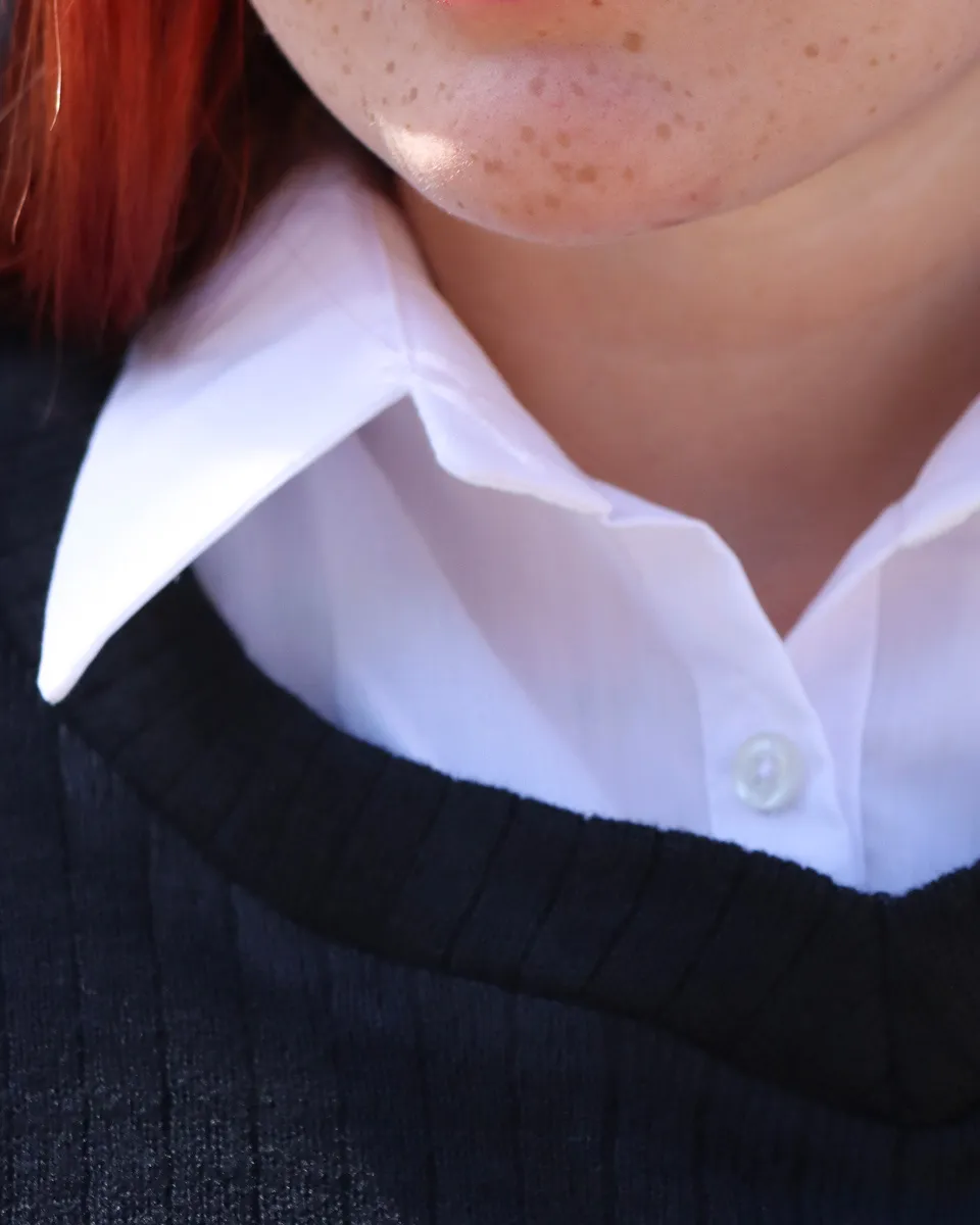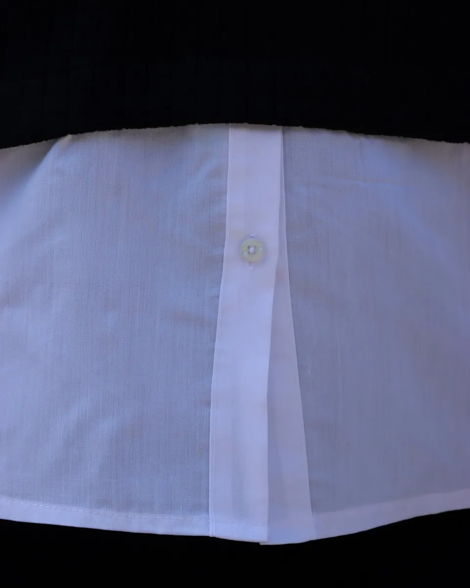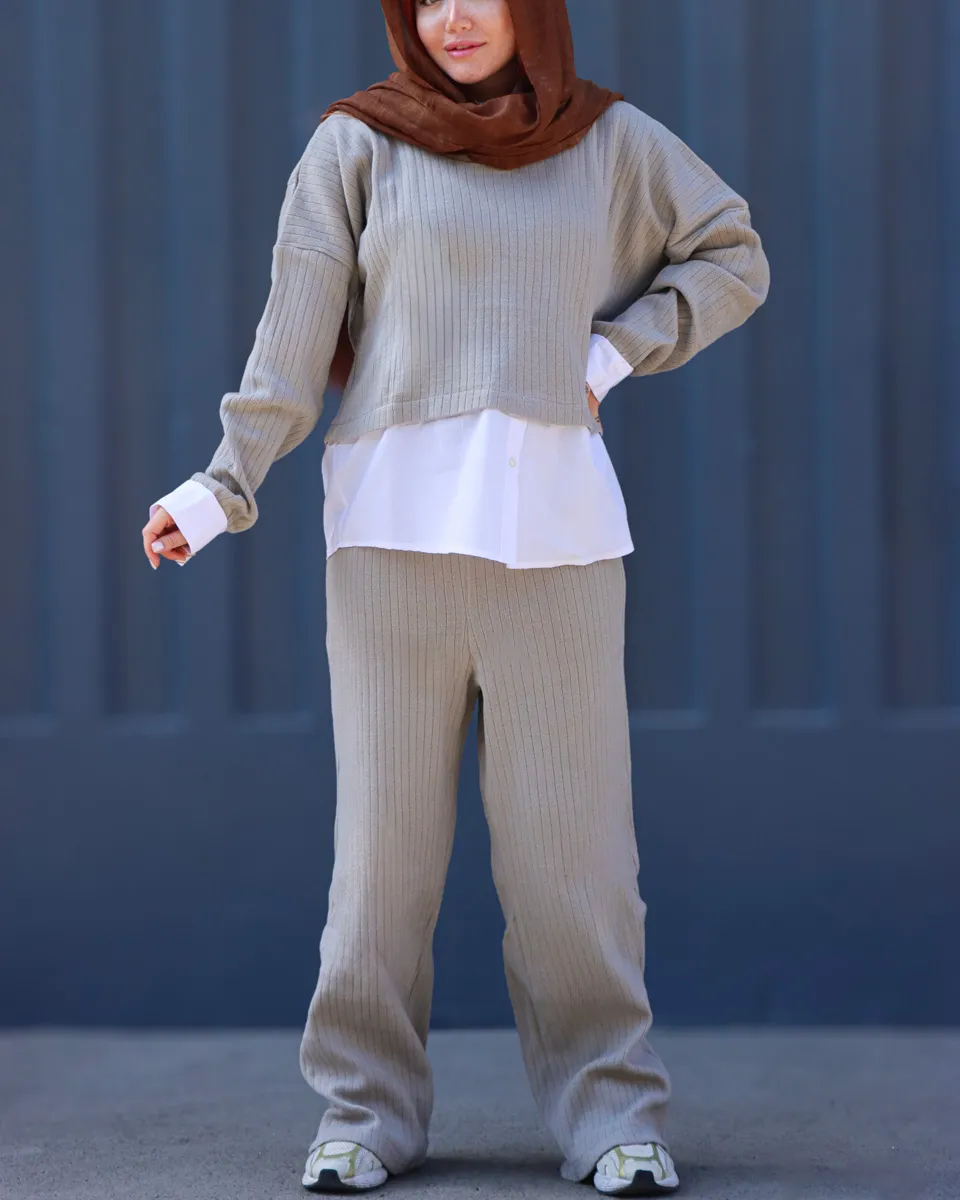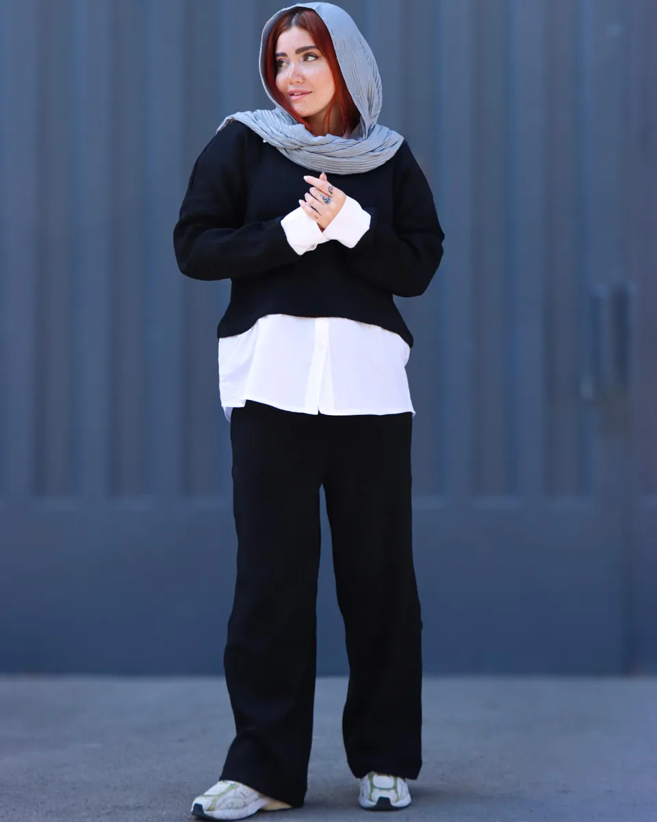 طراحی این ست با تکهدوزی پارچه نخی سفید در قسمت یقه، مچ آستینها و پایین لباس جلوهای لایهدار و جذاب ایجاد کرده که حس پوشیدن یک پیراهن زیر بافت را القا میکند؛ بدون نیاز به اجرای چند لایه لباس.
