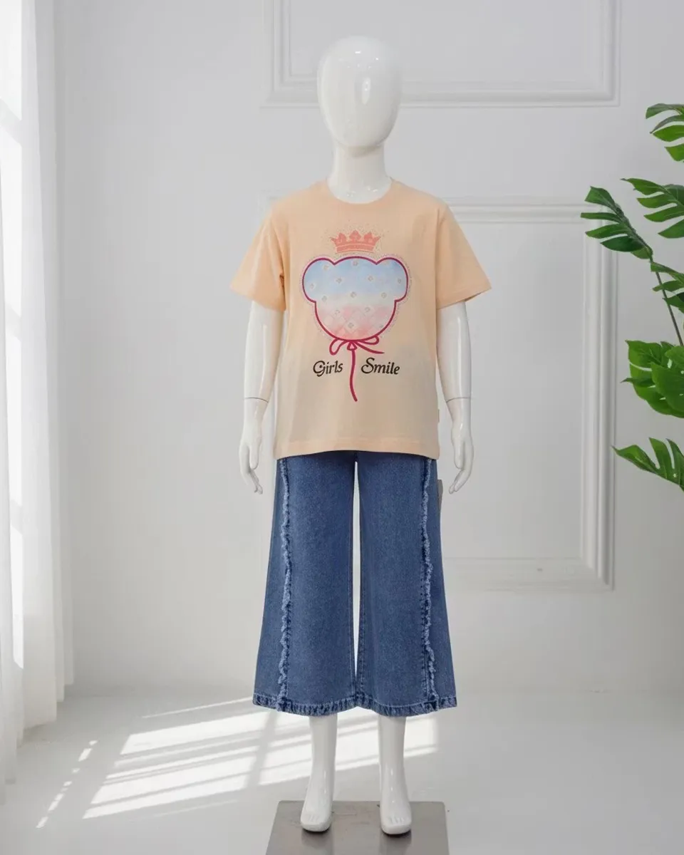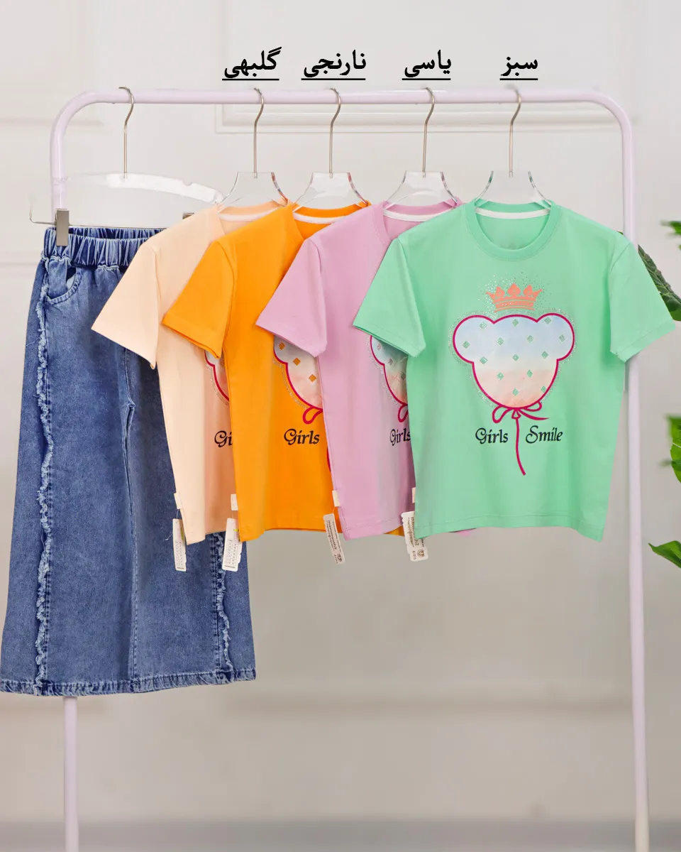 ست تیشرت و شلوار جین دخترانه |دو رو چاپ – سایز ۵۵ تا ۶۰ – رنگبندی شاد
