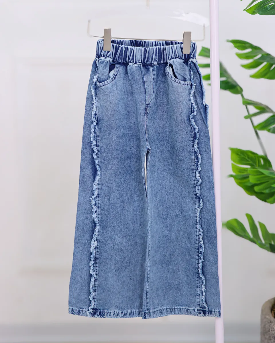 شلوار این ست از جنس جین سبک و راحت میباشد که مدل پاچه گشاد (بگ) دارد و ظاهری مدرن و جدید به استایل دخترانه میدهد.