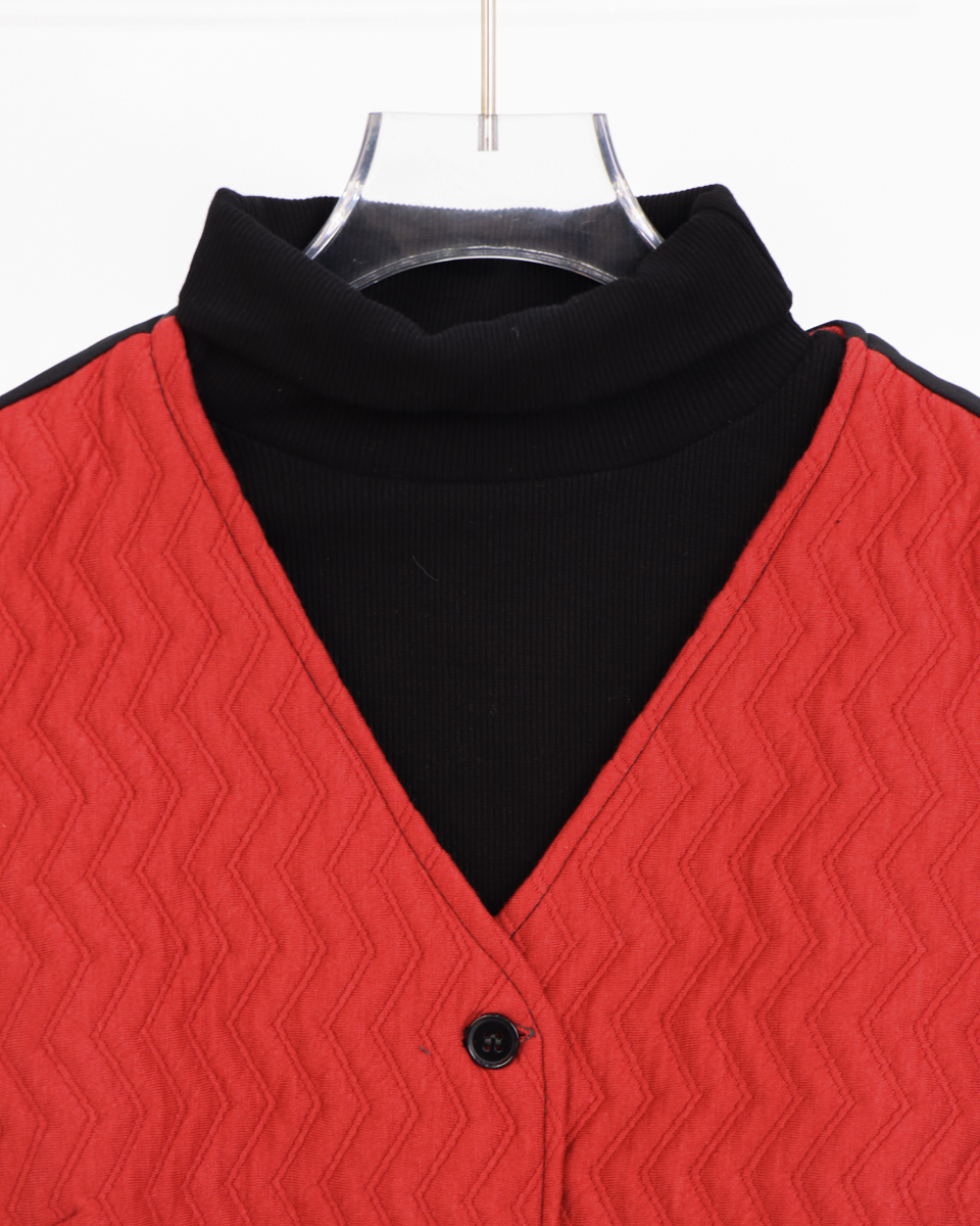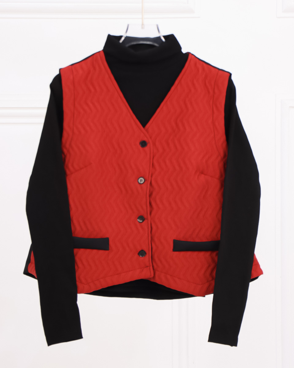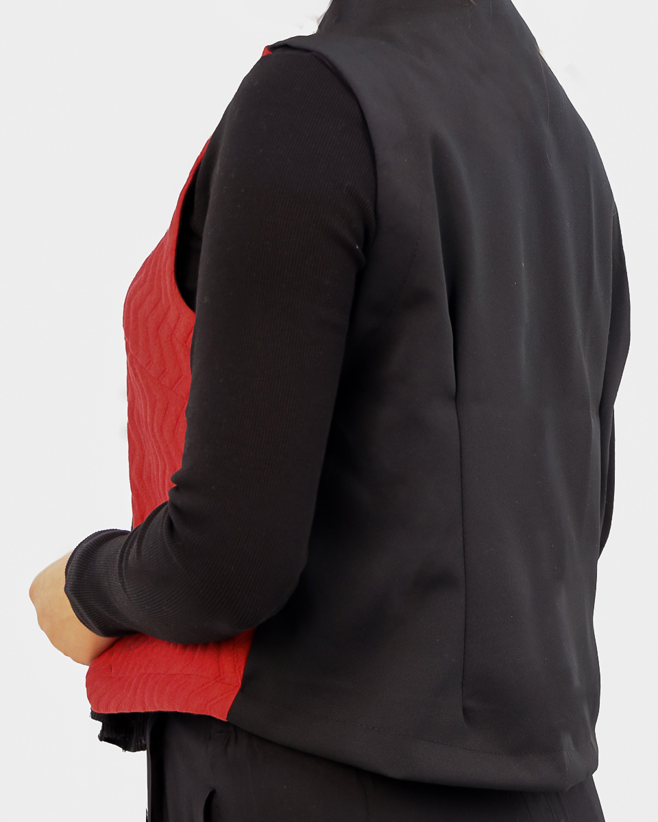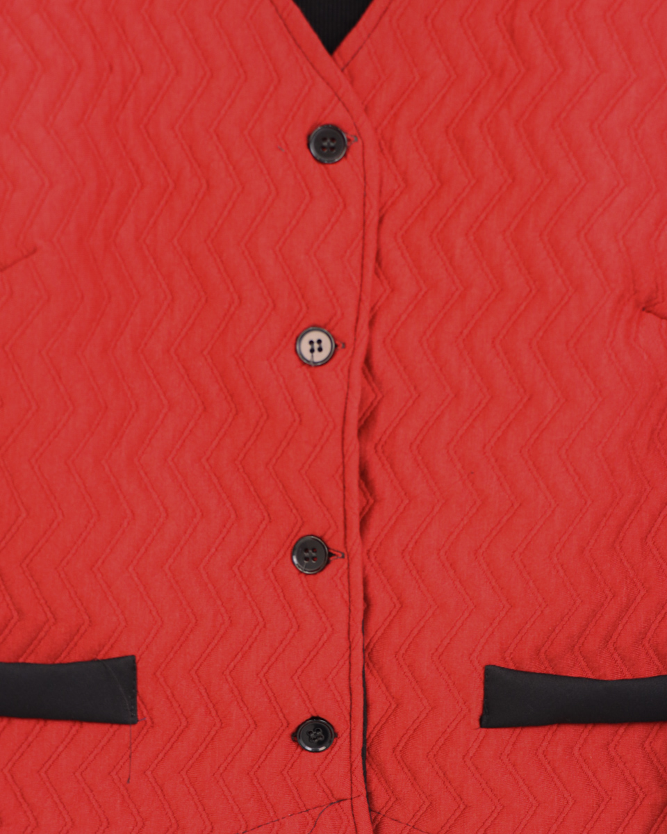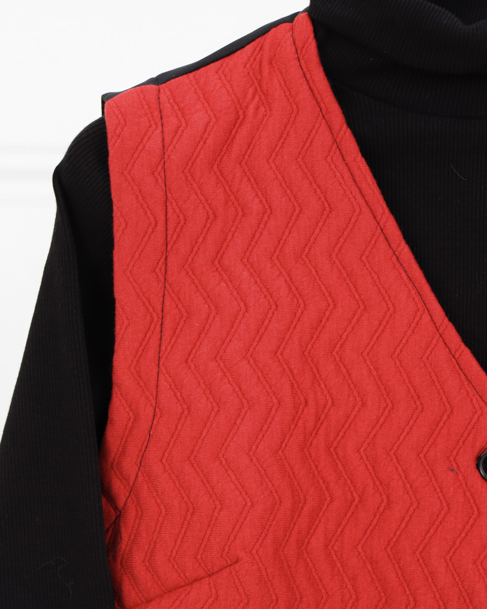 - جلیقه ژاکارد: قلب تپنده این ست، جلیقهای با پارچه ژاکارد پنبهای است که بافت برجسته و زیبای شورون (زیگزاگی) دارد. رنگ قرمز پرانرژی آن در کنار جزئیات ظریف مانند دکمهها و نوارهای مشکی روی جیبهای نما، ظاهری لوکس و خاص به آن بخشیده است.