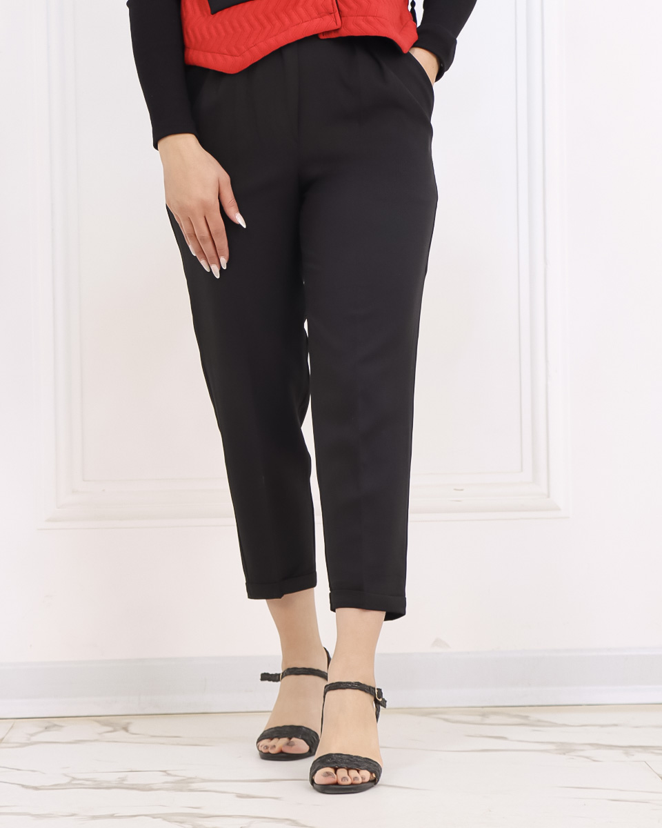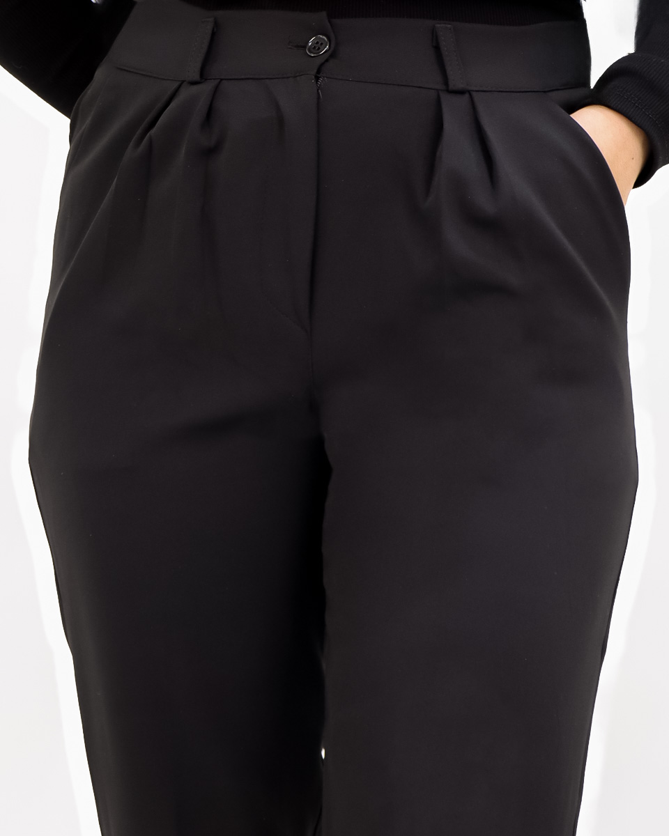 - شلوار مام استایل: شلواری بینهایت خوشدوخت از جنس کرپ مازراتی درجه یک که ایستایی فوقالعادهای دارد. طراحی آن به صورت مام استایل با پیلیهای دوقلو در جلو و فاق بلند است که فرمی بسیار شیک و مدرن به اندام شما میدهد. قد شلوار تا روی مچ پا بوده و برای نمایش کفشهایتان عالی است.