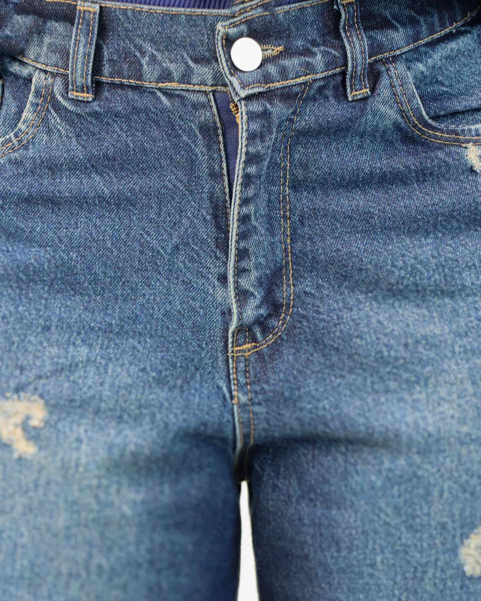 - جزئیات زاپ (Distressing): روی شلوار به صورت استراتژیک، زاپها و ساییدگیهای ظریفی ایجاد شده که ظاهری مدرن و جسورانه به آن میبخشد بدون آنکه بیش از حد پارگی داشته باشد.