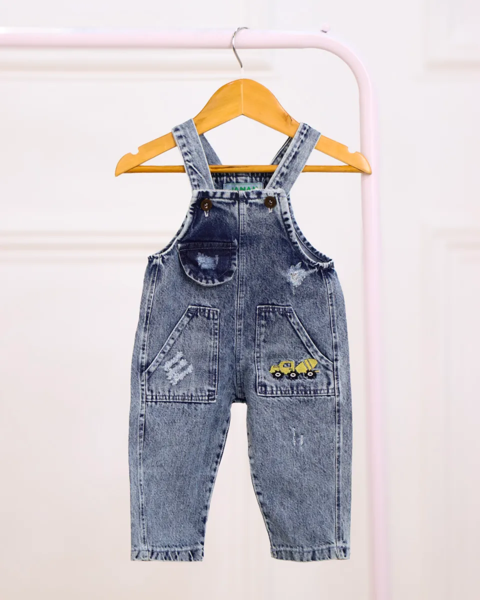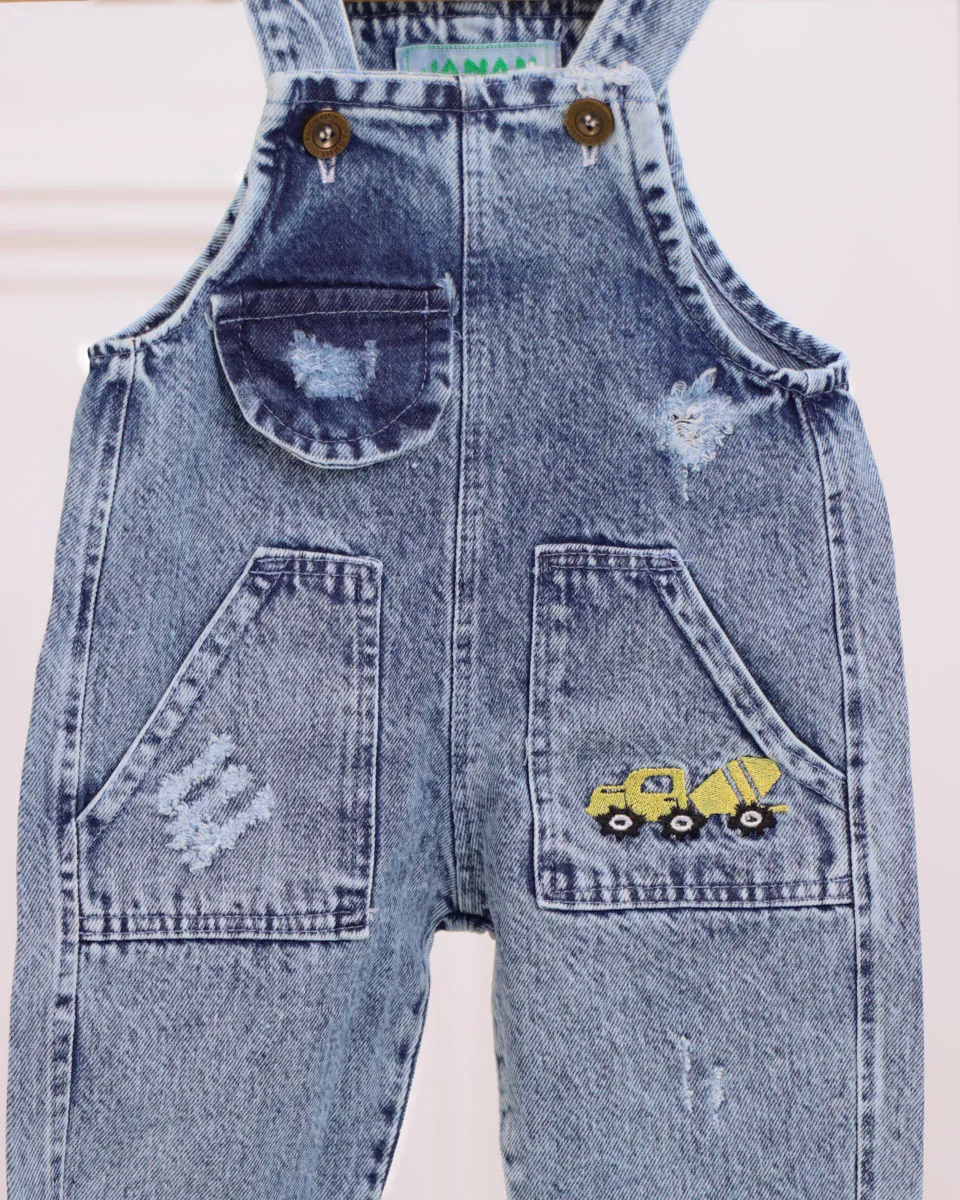 - جزئیات طراحی: بیلر سوت (سرهمی) با بندهای قابل تنظیم، گلدوزی باکیفیت طرح کامیون میکسر روی جیب جلو، دارای زاپهای ظریف و تزئینی، جیب پاکتی در جلو سینه و جیبهای کاربردی در طرفین و پشت.