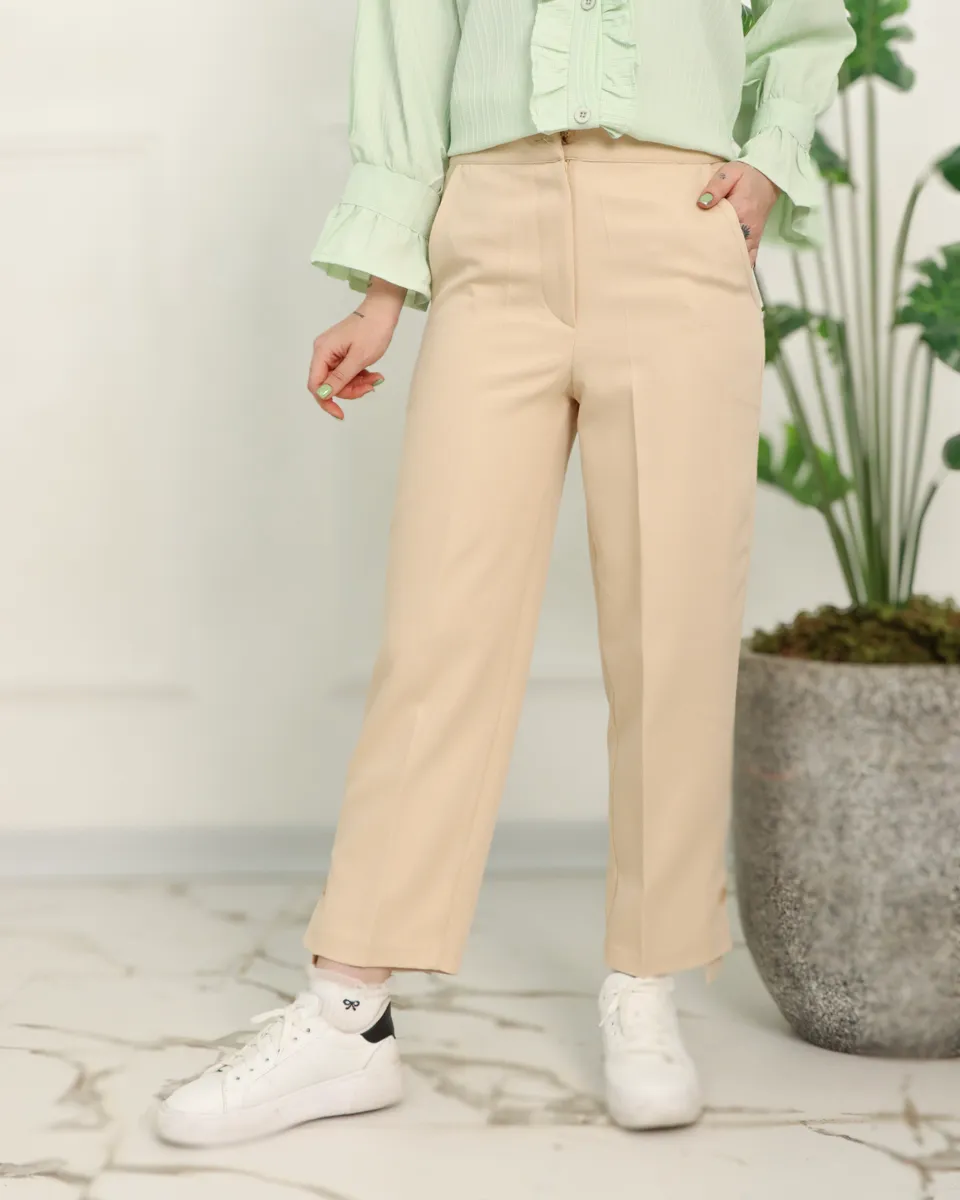 جزئیات ظریف، مثل خط وسط اتو خورده و دکمه تزئینی پایین پاچه، یک جلوه متفاوت و لاکچری به این مدل داده. همین باعث شده این شلوار انتخابی مناسب برای محل کار، مهمانیهای نیمهرسمی یا حتی استایل روزمره باشه.