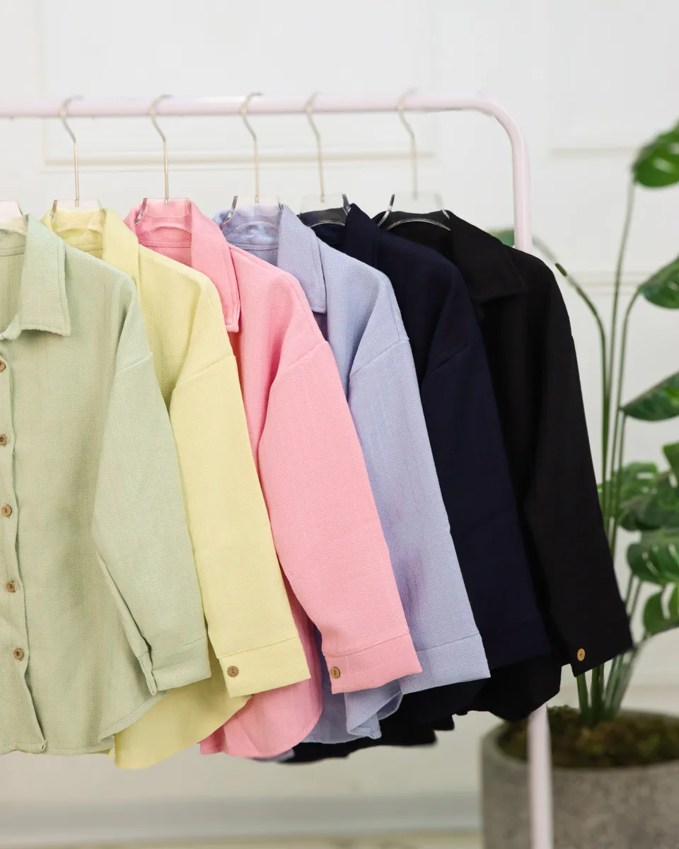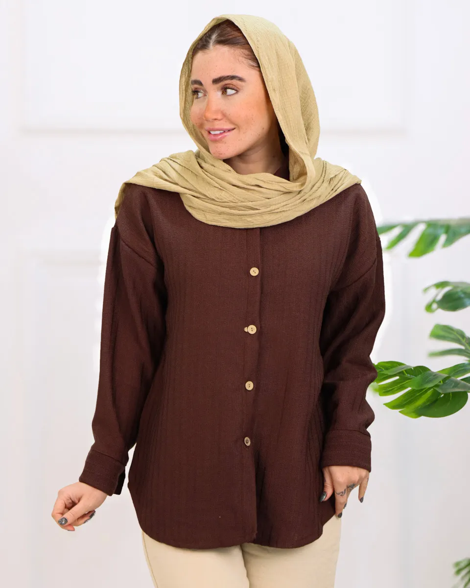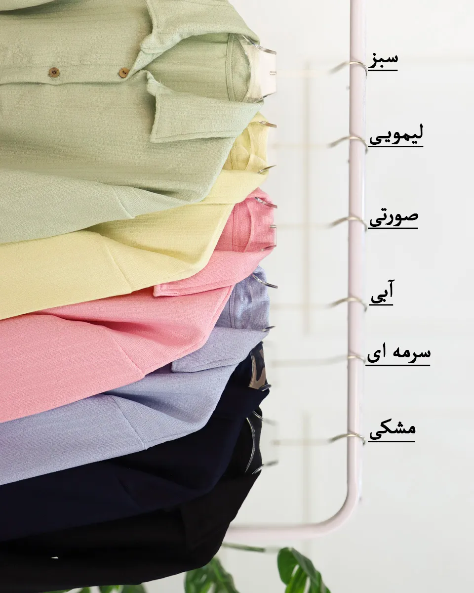 - جزئیات طراحی: یقه مردانه کلاسیک، سرآستین دکمهدار، برش هلالی در پایین لباس برای استایل بهتر، دکمههای همرنگ پارچه.