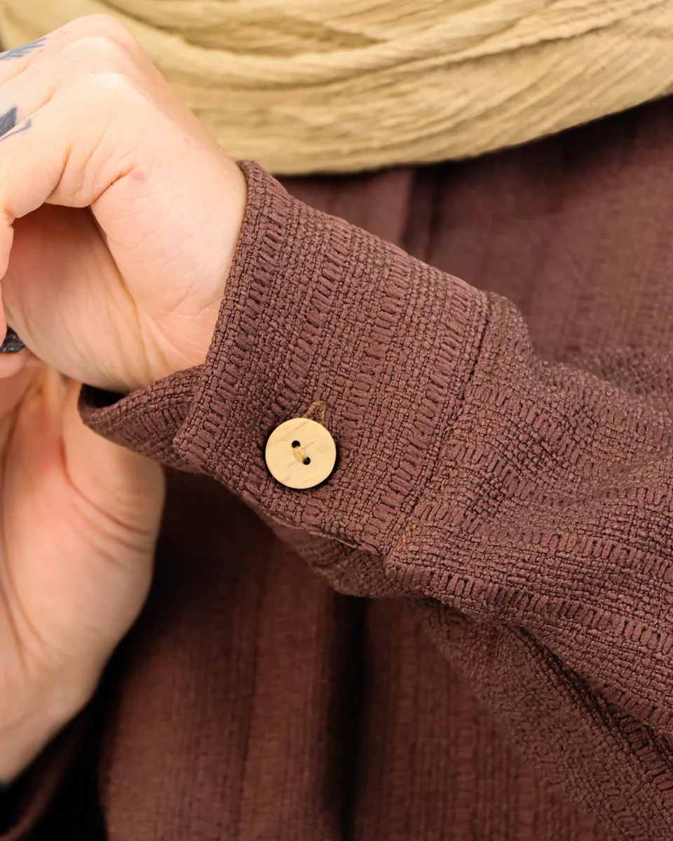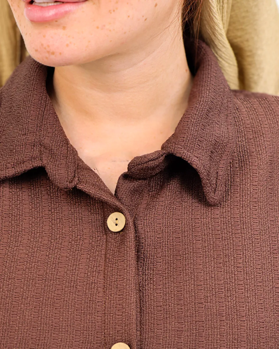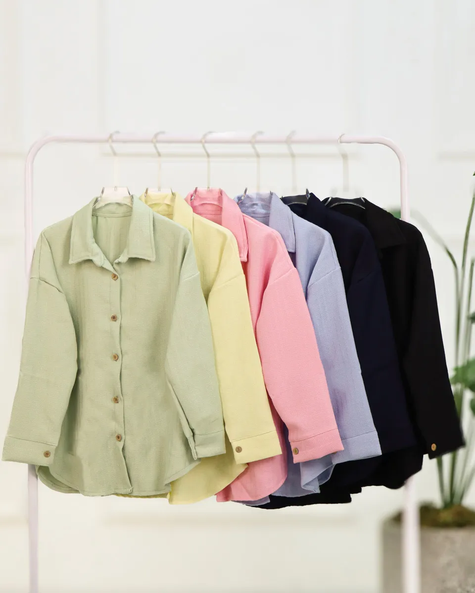 - جزئیات طراحی: یقه مردانه کلاسیک، سرآستین دکمهدار، برش هلالی در پایین لباس برای استایل بهتر، دکمههای همرنگ پارچه.