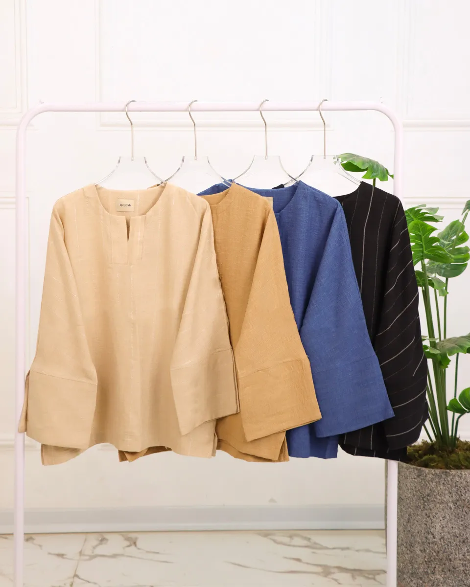 - آستینهای کلوش و برشدار: طراحی آستینها به صورت گشاد و کلوش همراه با یک چاک عمودی، امضای خاص این مدل است. این جزئیات نه تنها ظاهری هنری و مدرن به شومیز بخشیده، بلکه باعث حرکت و پویایی بیشتر در استایل شما میشود.