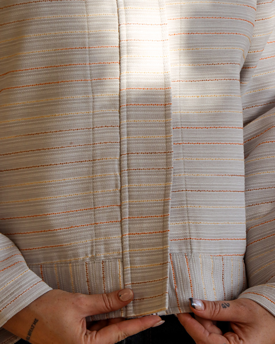 ترکیب پارچه طرحدار راه راه ریز، دو جیب جلویی و فرم کراپ آن را به انتخابی خاص و بهروز برای استایلهای زنانه تبدیل کرده است.