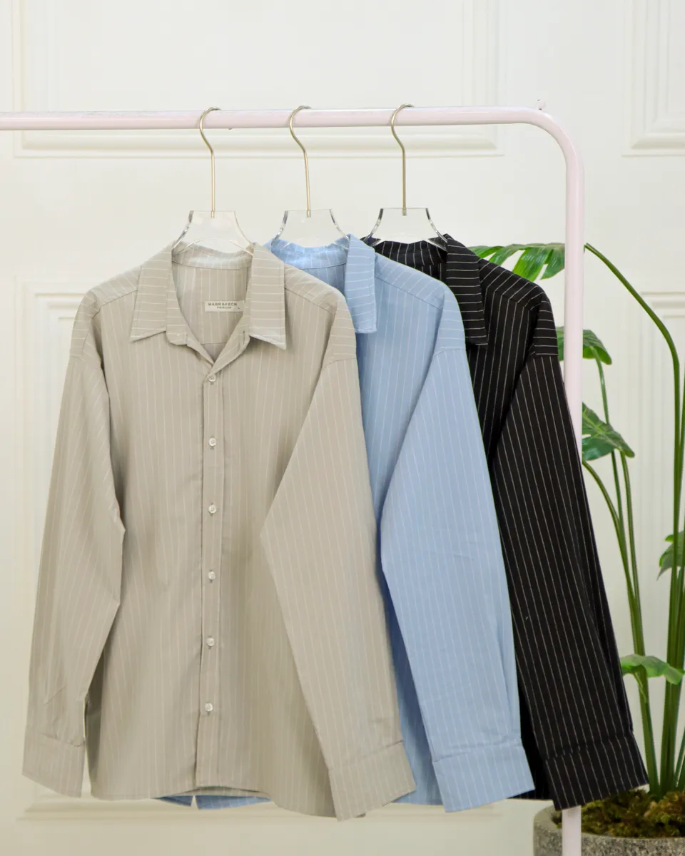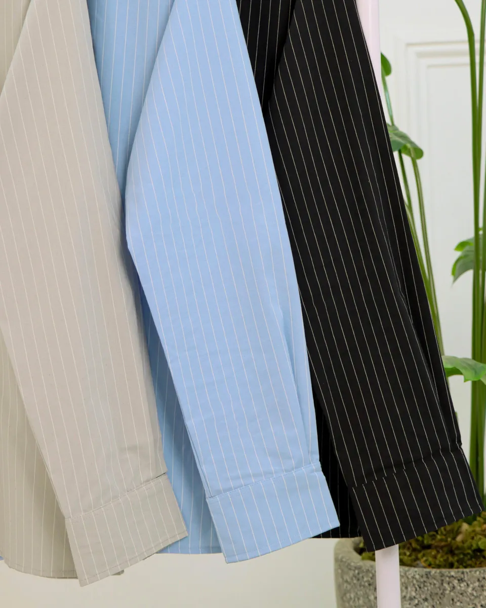 - جزئیات طراحی: طرح راه راه عمودی کلاسیک (Pinstripe)، یقه مردانه استاندارد، سرآستین دکمهدار