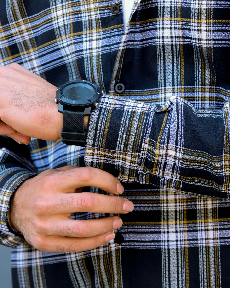 • جزئیات طراحی: طرح چهارخانه کلاسیک (Tartan)، یقه مردانه، سرآستین تک دکمه