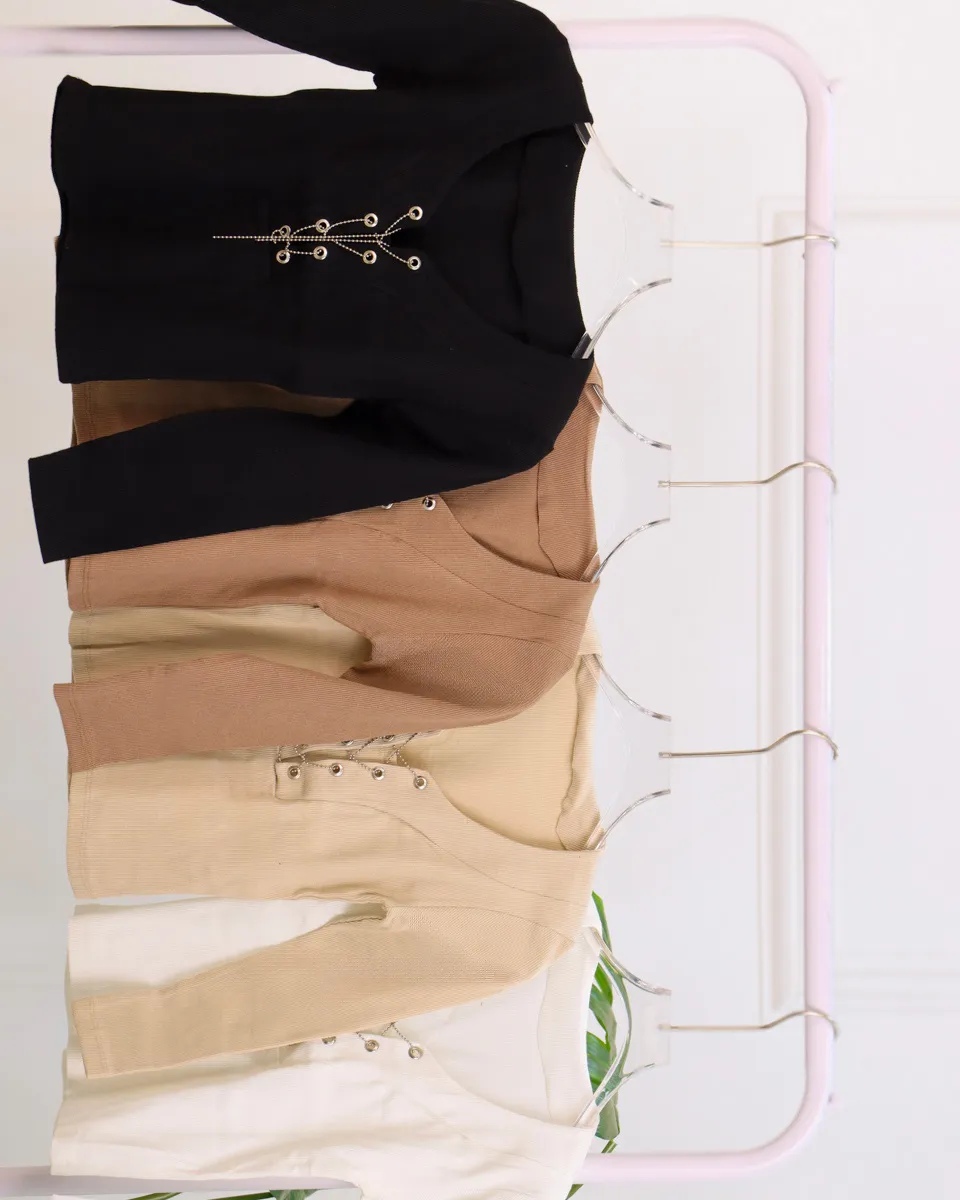 با کراپ تاپ آستین بلند کبریتی، جزئیات را به استایل خود اضافه کنید! این کراپ تاپ شیک که از پارچه نرم و کشی نخ پنبه کبریتی تولید شده، با فرم فیت خود به زیبایی بر روی تن مینشیند و اندام شما را برجسته میکند. اما چیزی که این مدل را منحصربهفرد میکند، طراحی یقه آن است؛ یک یقه هفت بندی که با یک زنجیر ظریف و شیک تزئین شده و نگاهها را به خود جلب میکند.