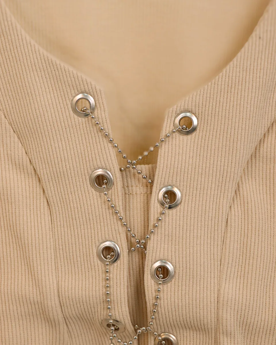 جنس این محصول نخ پنبه کبریتی است. بافت کبریتی نه تنها ظاهری جذاب و کلاسیک به لباس میدهد، بلکه به دلیل خاصیت کشسانی بسیار بالا، راحتی فوقالعادهای را فراهم کرده و باعث میشود لباس کاملاً فیت تن شما باشد. پارچه آن بسیار نرم و لطیف است و برای پوست حساسیت ایجاد نمیکند. نقطه عطف طراحی، در قسمت یقه V شکل آن است که با پانچهای فلزی، بندهای ضربدری و یک زنجیر تزئینی تکمیل شده و این کراپ ساده را به یک قطعه خاص و مدرن تبدیل کرده است.