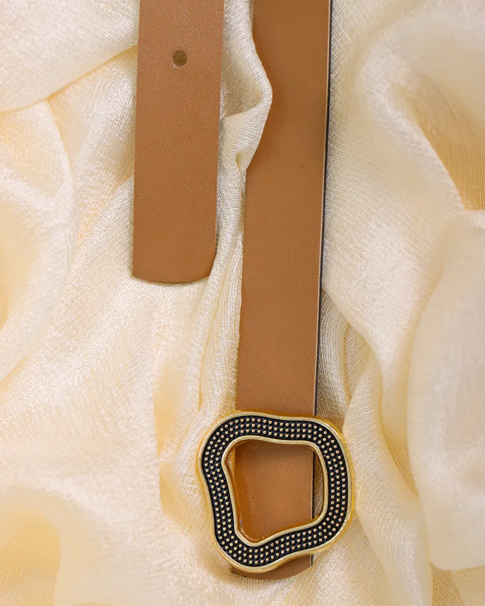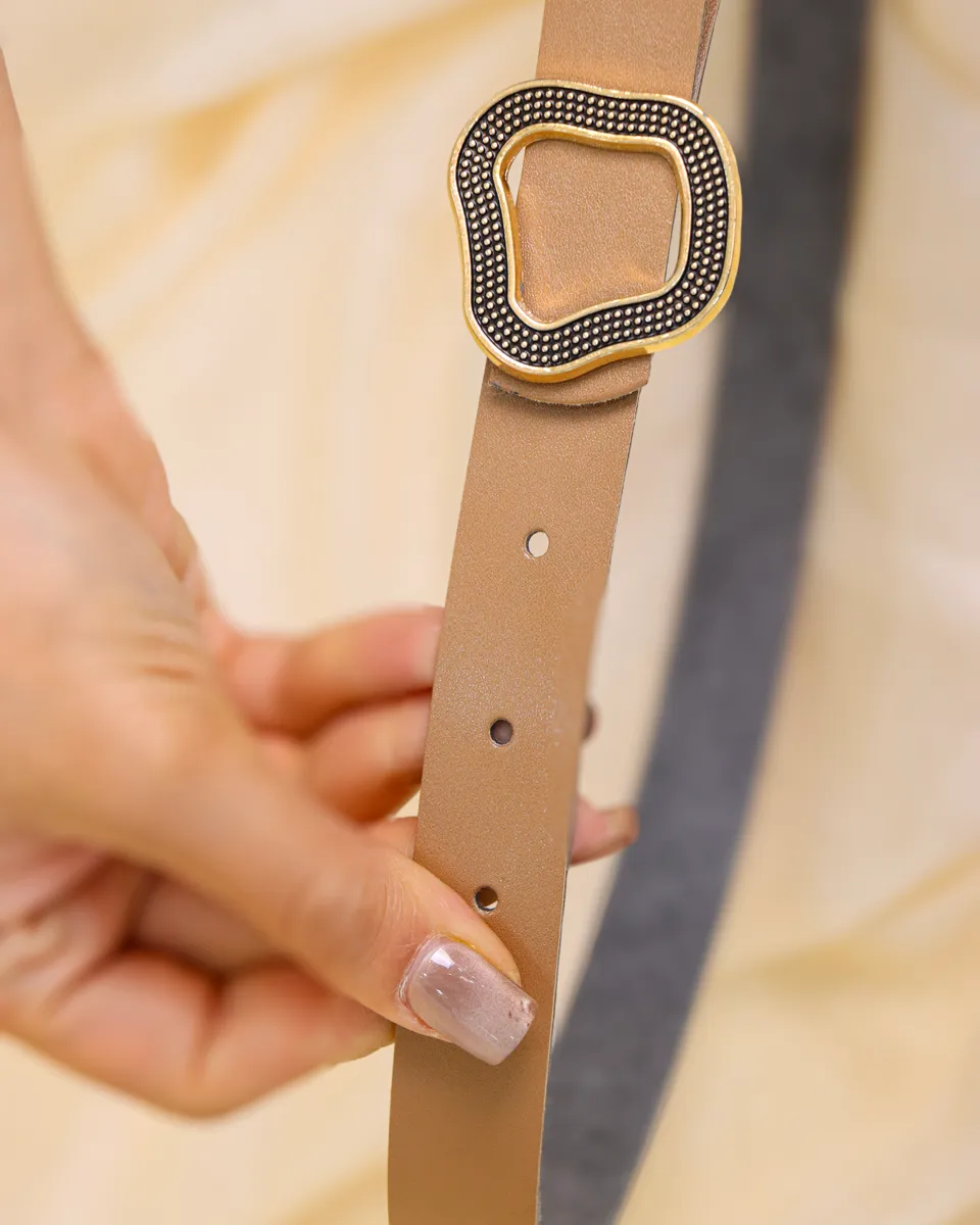 این کمربند زنانه از چرم مصنوعی باکیفیت ساخته شده و با رنگ کرم جذابش، به راحتی با انواع لباسهای رسمی، نیمهرسمی و روزمره ست میشود. نقطهی توجه این محصول، سگک طلایی خاص و مدرن با طراحی منحنی و بافتدار است که جلوهای لوکس و متفاوت به کمربند میبخشد.